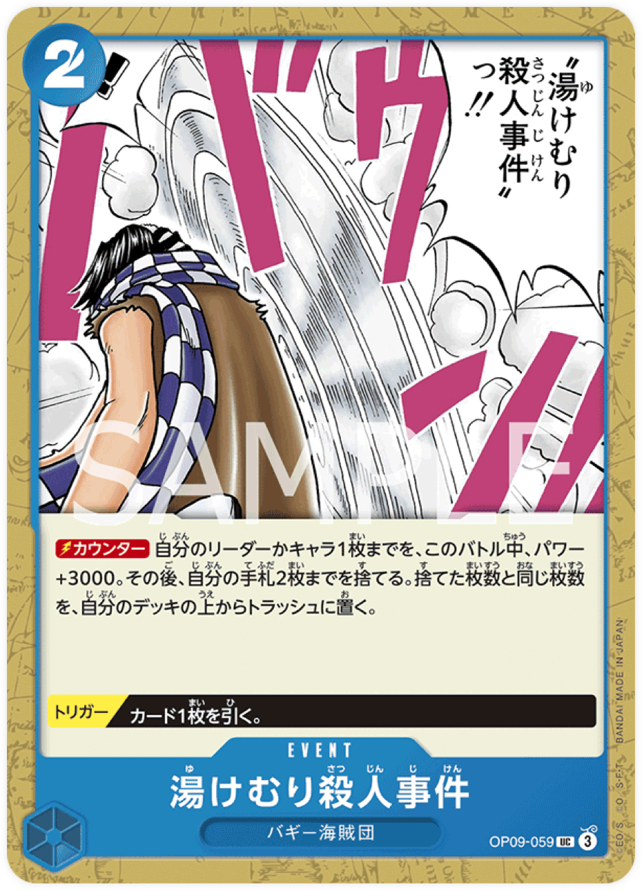 Cette carte événement fait référence à un moment unique dans l’univers de One Piece, où un incident mystérieux se déroule sous les vapeurs, capturant l’attention et la suspicion des personnages. L’image montre une scène dramatique avec un personnage vêtu d’un foulard à carreaux, tournant le dos à l’explosion de vapeur qui semble témoigner d’un acte violent. Le style graphique est percutant, avec des effets sonores visuels représentés en caractères japonais, amplifiant l’impact de la scène. Issue de l’extension OP09, sortie le 30 août 2024 au Japon, cette carte plonge les joueurs dans les situations tendues et parfois humoristiques de l’univers de Buggy le Clown et de son équipage.