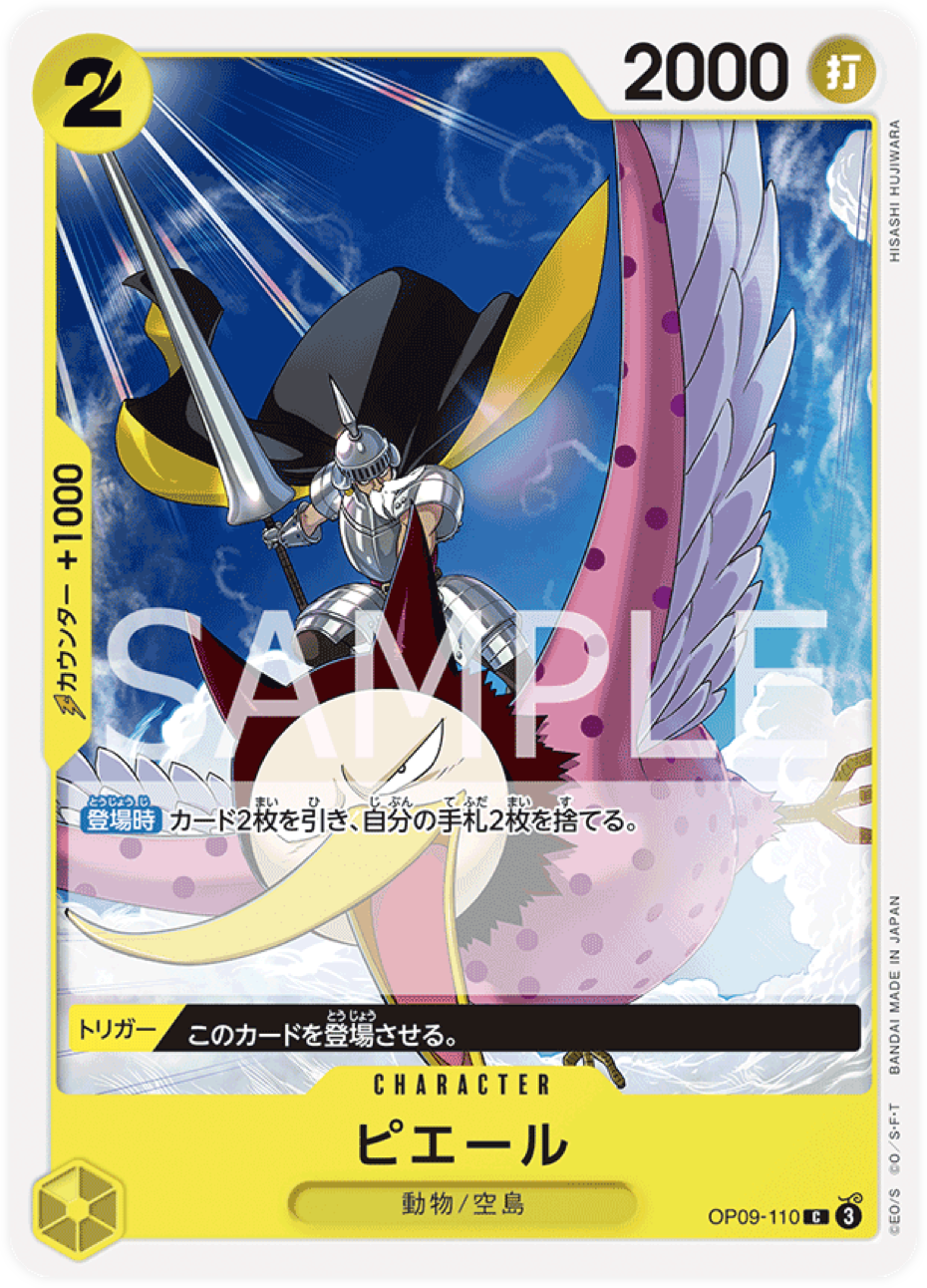 Cette carte One Piece présente Pierre, un personnage particulièrement unique dans l’univers de One Piece. Il est un oiseau avec un corps de chevalier, portant une armure brillante et brandissant une épée imposante. L’illustration le montre dans une posture héroïque, dominant le ciel, prêt à se battre. Ce personnage appartient au groupe des Animaux et est classé sous le sous-type Oiseau, un rôle intéressant qui montre l’aspect étonnant de certains personnages du manga. La carte a été dessinée par Hisashi Huwiwara et fait partie de la collection OP09, sortie le 30 août 2024.