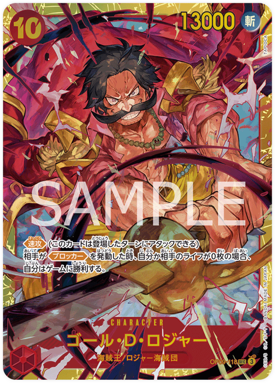 Effet principal : Attaque rapide (peut attaquer dès qu’il est joué). Si l’adversaire utilise un blocker, et que la vie de l’adversaire atteint 0 cartes, le joueur contrôlant Gol D. Roger gagne la partie.