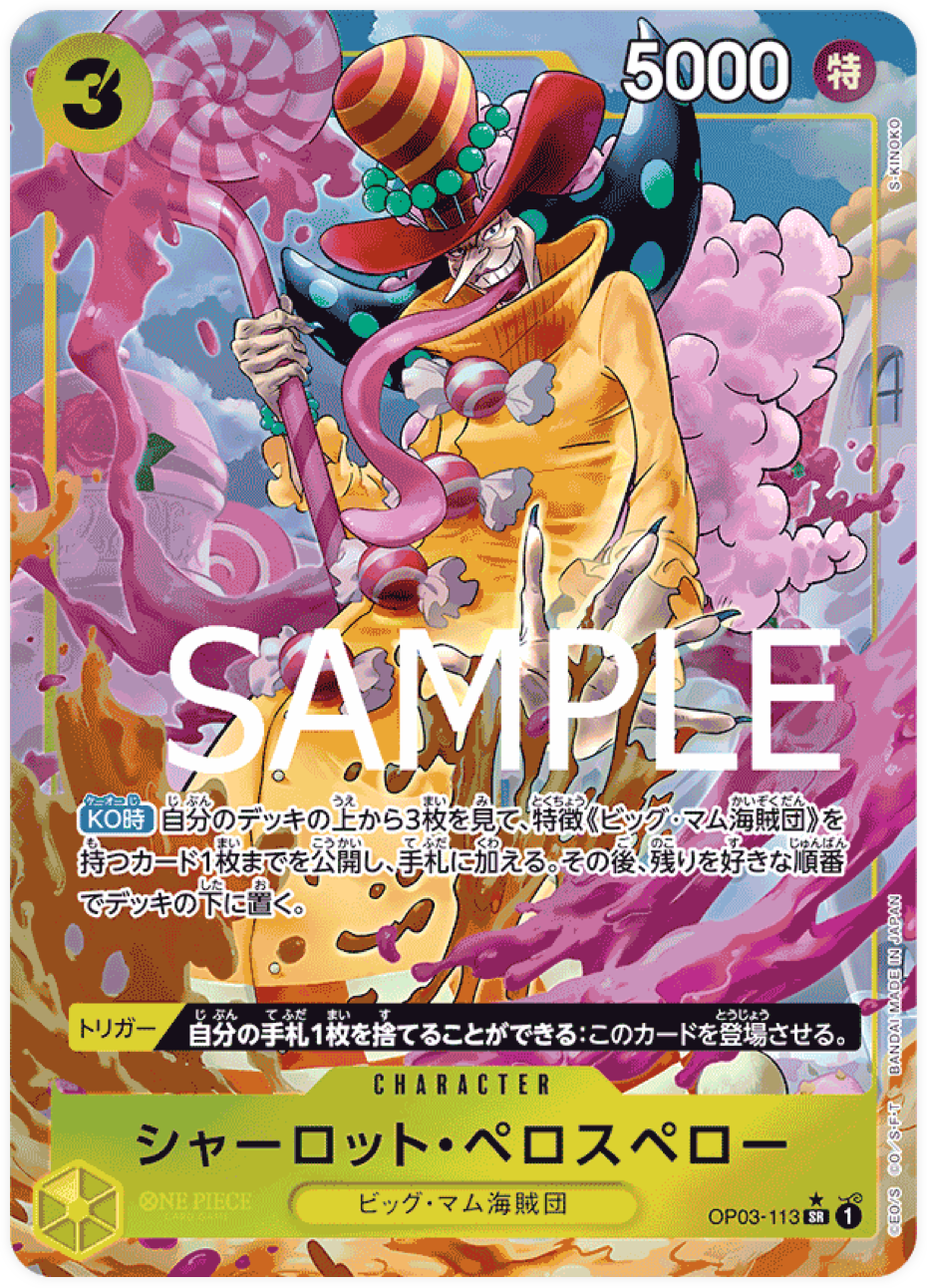 • Capacité (KO時) : Lorsqu’il est mis KO, cette carte permet au joueur de regarder les trois cartes du dessus du deck et de choisir une carte portant le trait Pirates de Big Mom. Cette carte sélectionnée peut être ajoutée à la main, tandis que les autres sont replacées au bas du deck dans l’ordre de son choix. Cette capacité montre son rôle de soutien pour la continuité de l’équipage de Big Mom, en permettant de récupérer des ressources même après son élimination.