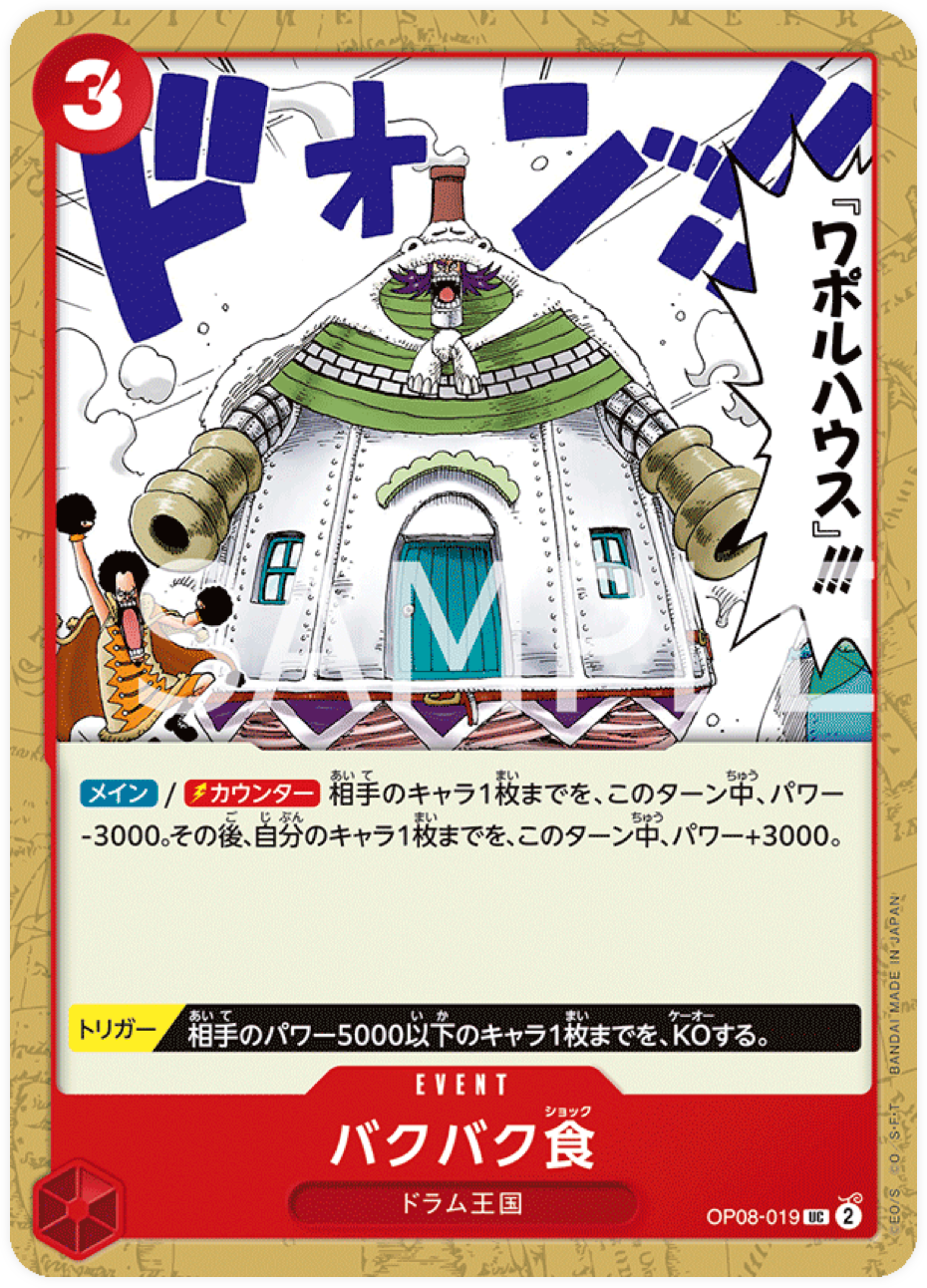 La carte OP08-019 Munch-Munch Mutation fait référence au pouvoir du Baku Baku no Mi (ou Munch-Munch Fruit) de Wapol, l’ancien roi tyrannique de l’île de Drum, tel qu’il apparaît dans l’arc Drum de One Piece. Le Baku Baku no Mi est un fruit du démon de type Paramecia qui permet à Wapol de manger n’importe quel objet, être vivant ou même lui-même, et de fusionner ce qu’il mange avec son propre corps.