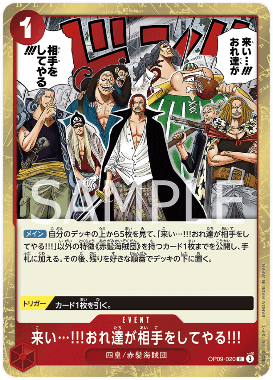 Cette carte One Piece, intitulée « Koi…!!! Ore-tachi ga Aite wo Shiteyaru!!! », présente l’équipage du Roux, prêt à défier quiconque se dresse sur leur chemin. Au centre de l’illustration, Shanks se tient, charismatique et déterminé, entouré de ses compagnons fidèles : Ben Beckman, Yasopp, Lime Juice, Lucky Roo, et d’autres figures emblématiques de son équipage. Chacun affiche une attitude résolue, prêt à se battre pour leur capitaine et leurs idéaux. Cette carte, conçue par [nom du dessinateur] et lancée au Japon le 30 août 2024 dans l’extension OP09, immortalise la puissance collective des pirates du Roux.
