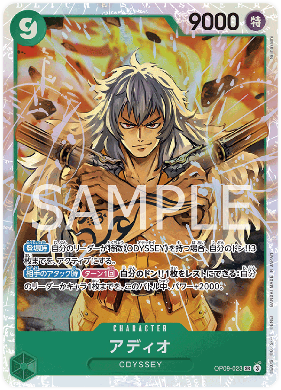 Sur cette carte One Piece de l’extension OP09, sortie au Japon le 30 août 2024, nous retrouvons Adio, un personnage mystérieux et intense, arborant une chevelure argentée et un regard perçant qui dégage une force implacable. Avec des tatouages et des marques sur son torse, Adio tient une arme imposante, évoquant son côté guerrier dans l’univers de One Piece. Les couleurs flamboyantes en arrière-plan soulignent l’intensité de son expression, révélant un personnage prêt à tout pour atteindre ses objectifs.