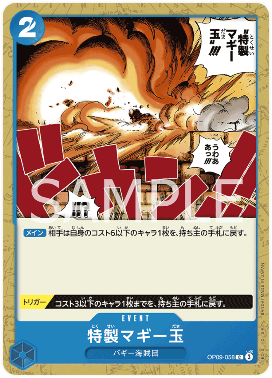 Cette carte événement de l’univers de One Piece est centrée sur l’une des techniques explosives les plus emblématiques de Buggy le Clown : la « Spéciale Mugi Dama » (ou « Bombe spéciale de Buggy »). L’illustration montre une énorme explosion qui capture toute l’intensité de l’attaque, avec des effets de feu et de fumée, fidèles aux impacts dévastateurs souvent associés aux attaques de Buggy. Les expressions stupéfaites des personnages alentour ajoutent une touche d’humour, typique du personnage de Buggy. Issue de l’extension OP09, sortie au Japon le 30 août 2024, cette carte est un hommage aux moments explosifs et inattendus que Buggy apporte dans le monde de One Piece.